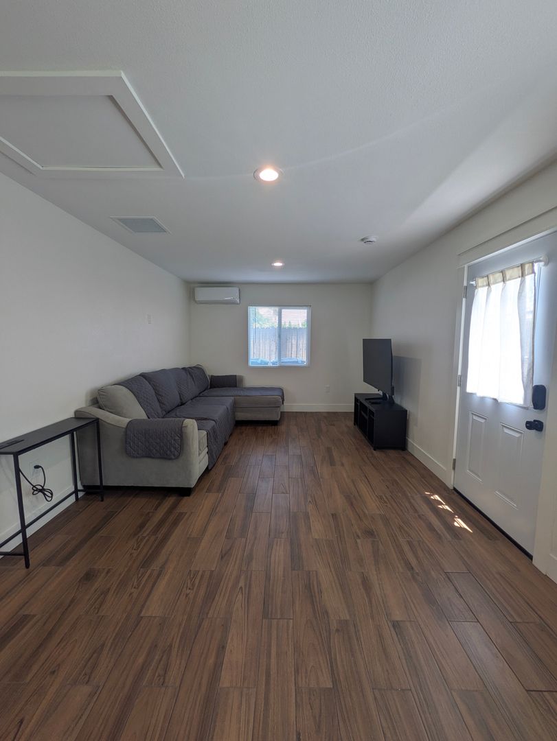 Cute, clean and ready for rent. 1 bedroom ADU in a quiet neighborhood. This property is almost new with beautiful, hard, wood-like flooring throughout. Inside laundry hookups, washer and dryer available. Mini-split air conditioners in the bedroom and main living area to stay cool all summer long. The kitchen has beautiful countertops and a full size stove/range. The large, stainless steel fridge can be included or you can bring your own. Large bedroom with closet with built-ins and ceiling fan; bed and side tables can be included. Close to all Riverside has to offer. This home is within 20 minutes of all three of Riverside's top 3 universities. Water and Wi-fi included with the rent. No maintenance required for the patio area. Owner is asking for 650+ FICO, clean credit, no criminal activity, no prior evictions, 3X rent verifiable income and two years positive rental history.